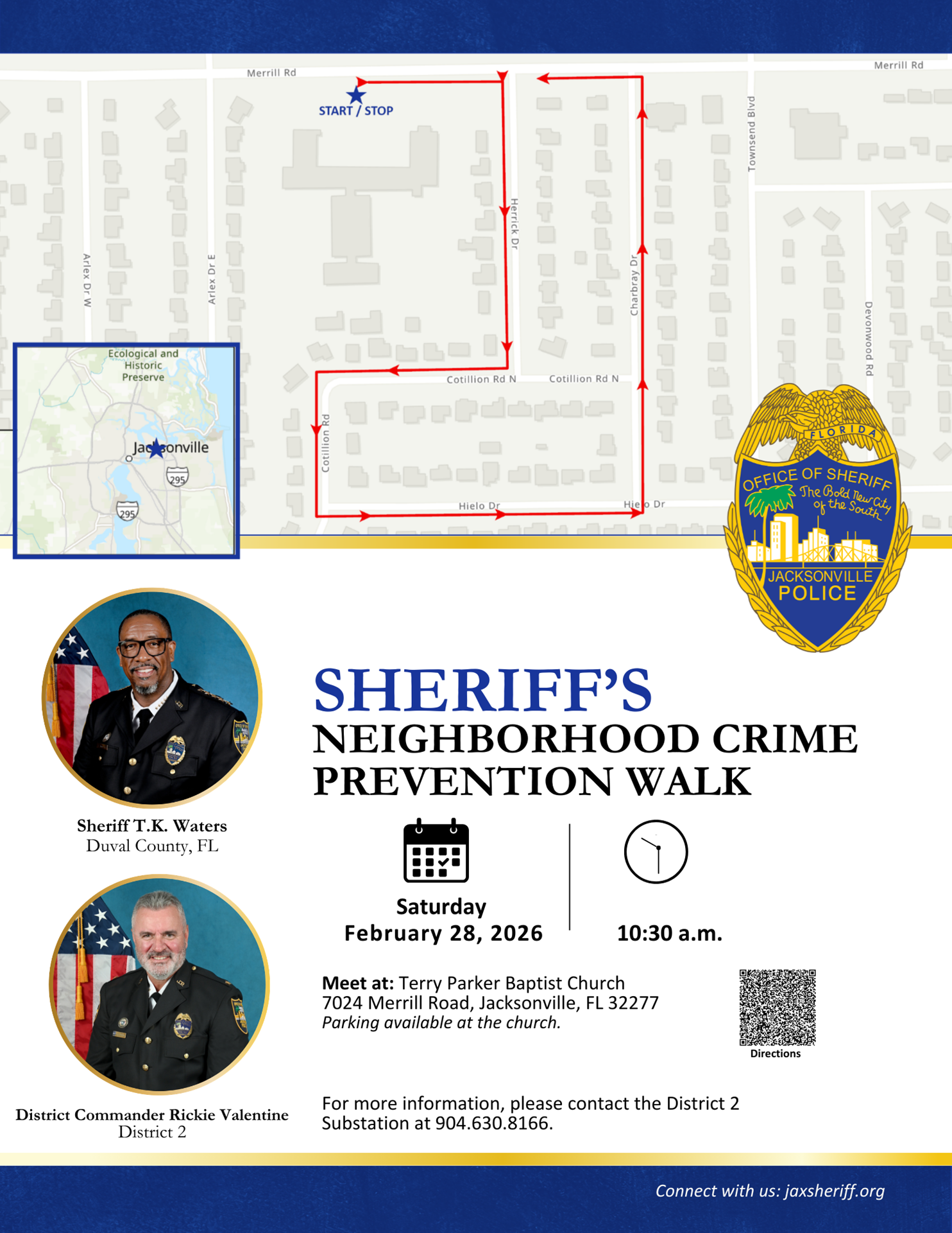 This Saturday, February 28, 2026, Sheriff T.K. Waters, members of his staff, and community partners are scheduled to walk in District 2. During the walk, the Sheriff will meet with citizens one-on-one to discuss their concerns in their area of town.
