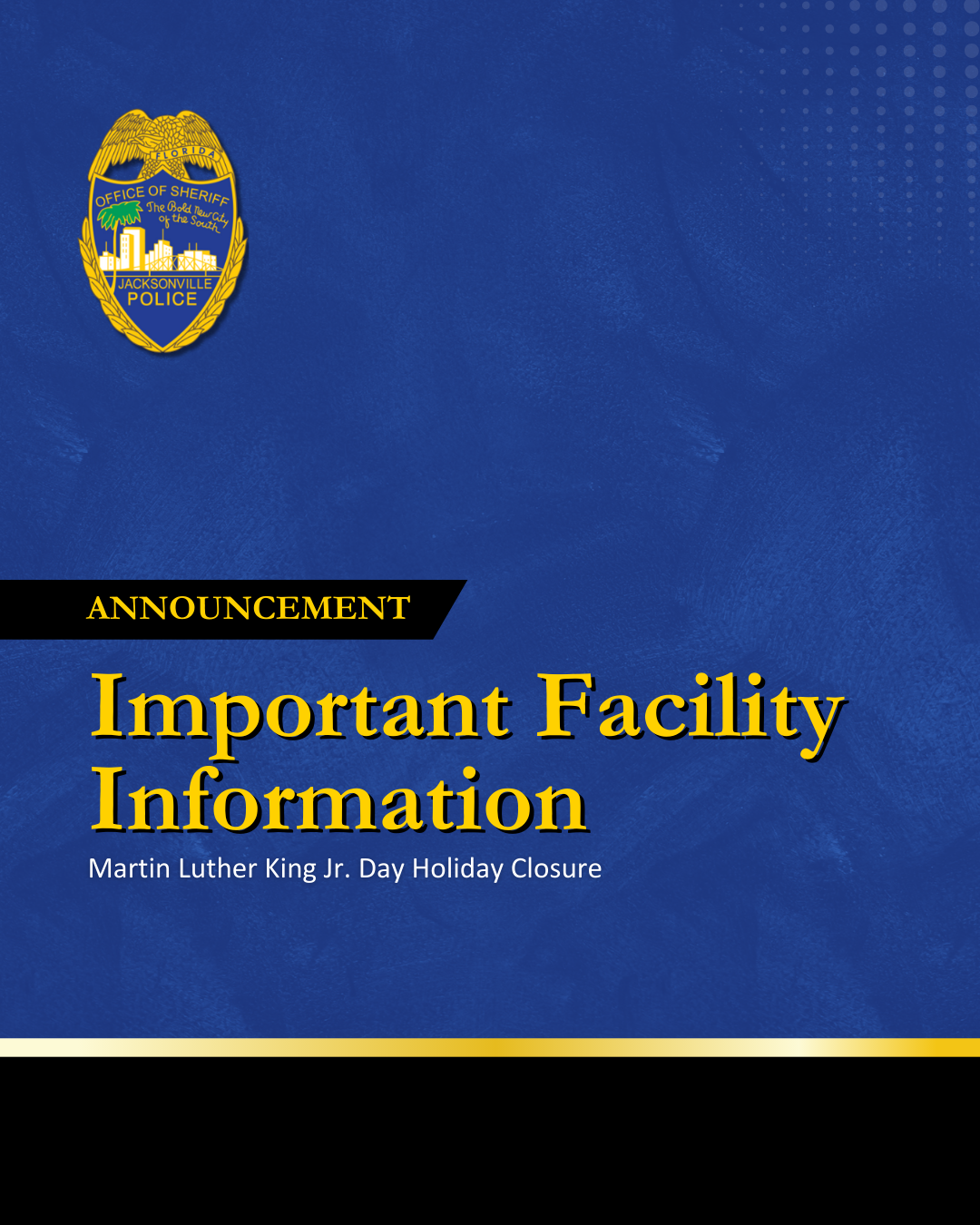 January 19, 2026 - In observance of the Martin Luther King Jr. Day holiday, all Jacksonville Sheriff’s Office publicly accessible buildings will be closed on Monday, January 19, 2026.