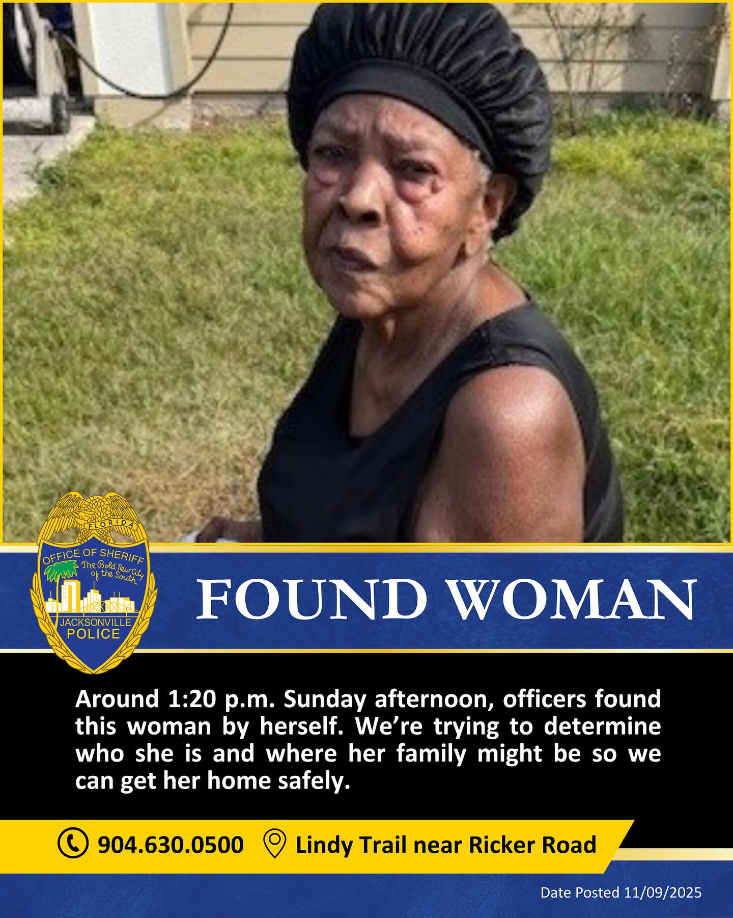 November 10, 2025 - The woman has been identified and reunited with her family. The Jacksonville Sheriff's Office is appreciative to everyone who shared the information on social media.