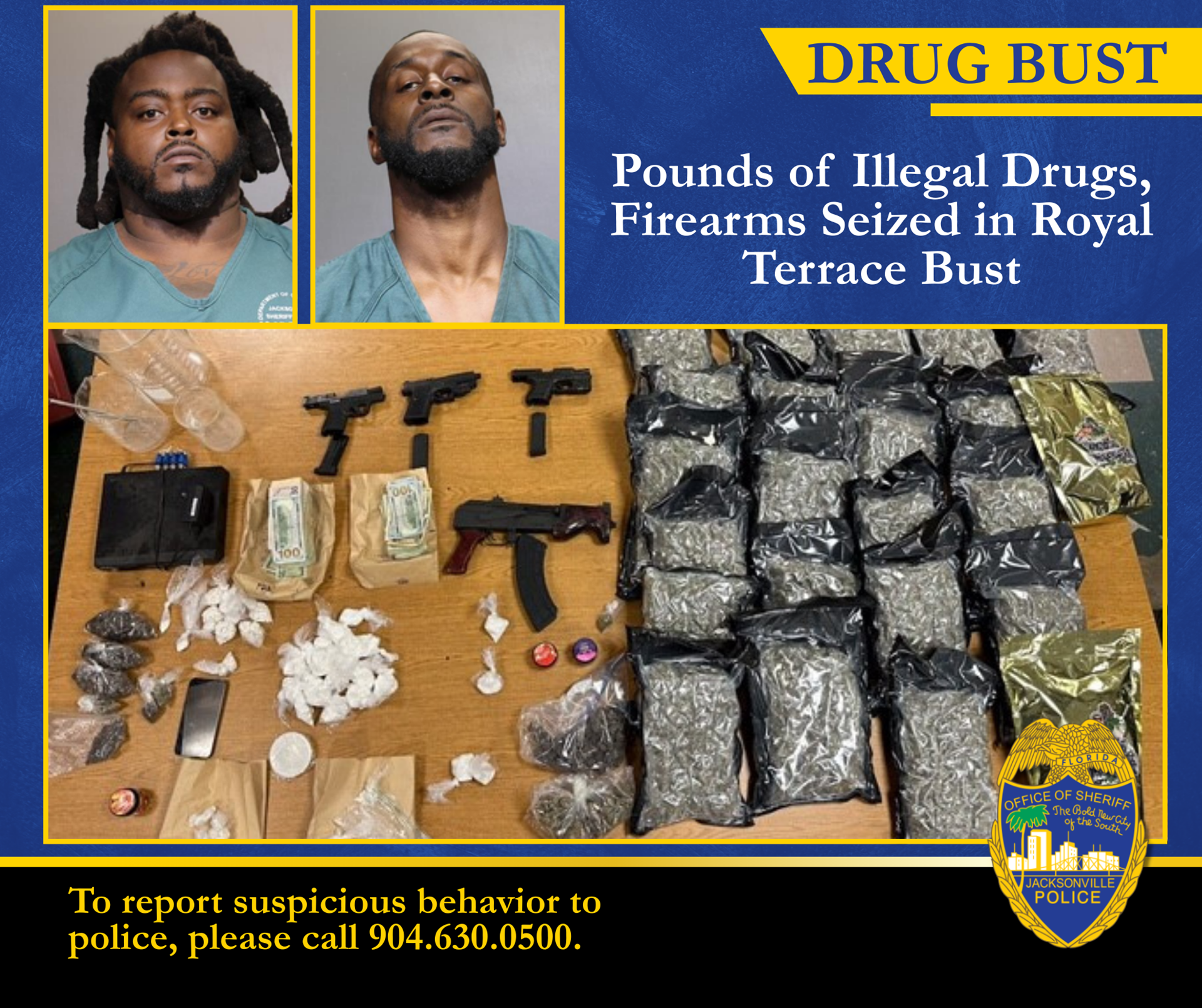 November 25, 2025 - Two convicted felons are facing more felony charges after Jacksonville Sheriff's Office (JSO) Narcotics detectives uncovered several pounds of illegal drugs inside a house in the Royal Terrace area of Jacksonville.