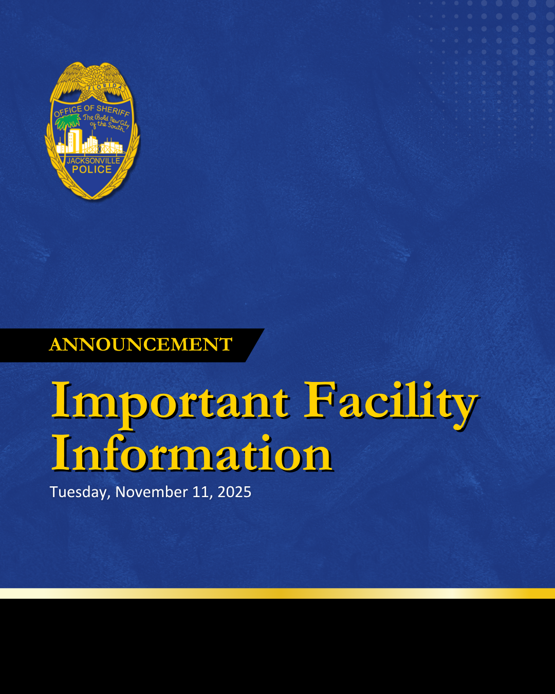 November 10, 2025 - In observance of Veterans Day, all Jacksonville Sheriff’s Office publicly accessible buildings will be closed on Tuesday, November 11, 2025.