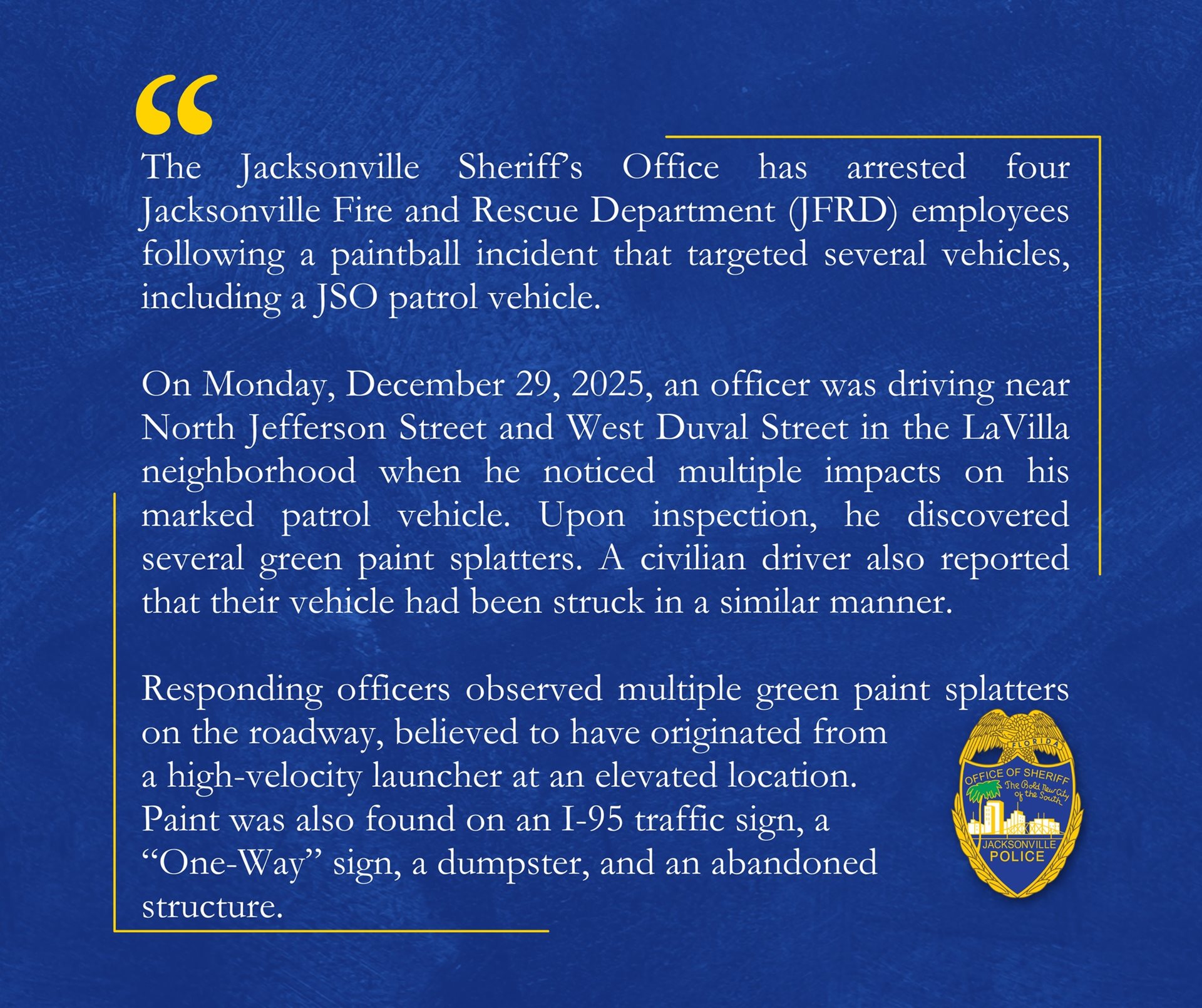 January 23, 2026 - The Jacksonville Sheriff’s Office (JSO) has arrested four Jacksonville Fire and Rescue Department (JFRD) employees following a paintball incident that targeted several vehicles, including a JSO patrol vehicle.