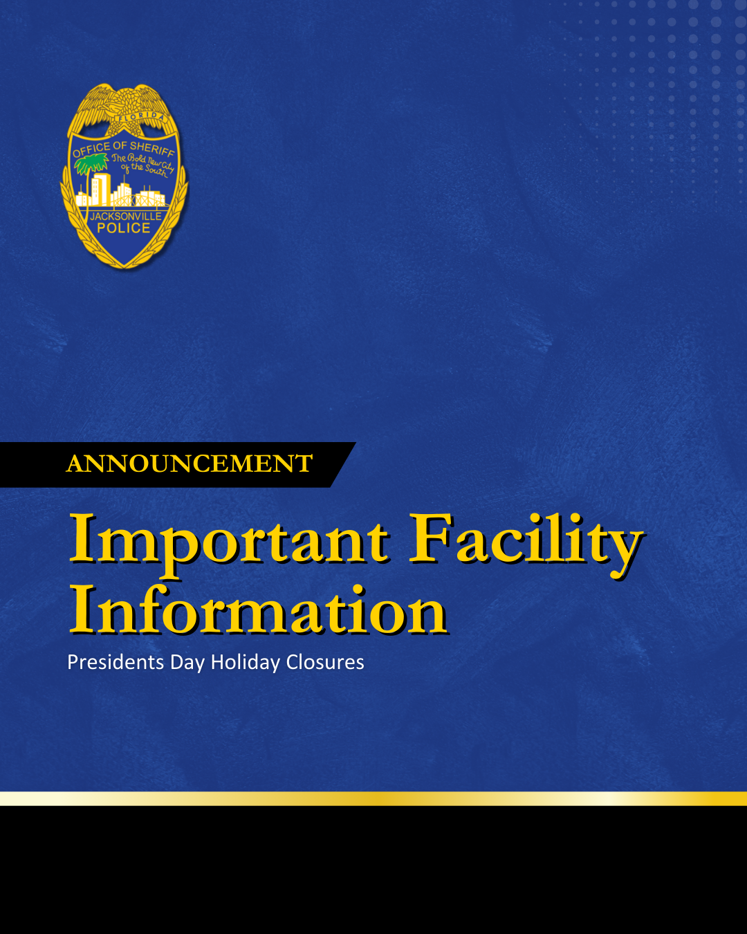 February 15, 2026 - In observance of the Presidents Day holiday, all Jacksonville Sheriff’s Office (JSO) publicly accessible buildings will be closed on Monday, February 16, 2026.